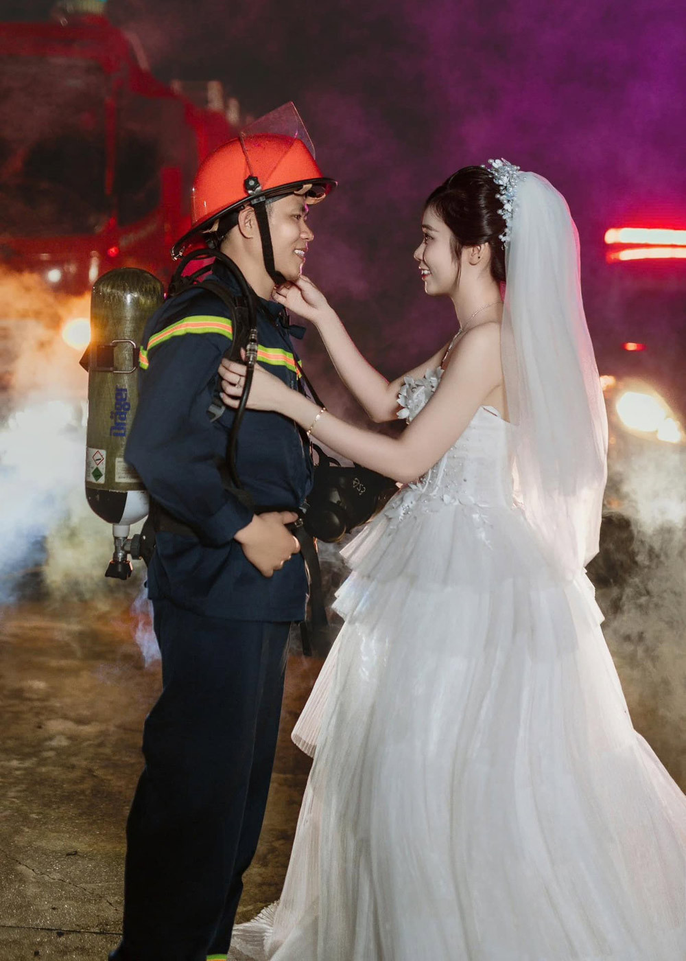 Bộ ảnh được chụp với ý tưởng đặc biệt liên quan đến nghề cứu hỏa của chồng cô, anh Lê Văn Anh (SN 1991, quê Nghệ An).
