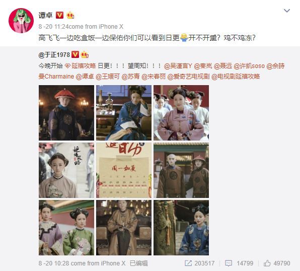 Đàm Trác viết: "Cao Quý Phi ta đây vừa ăn cơm hộp vừa phù hộ cho các người có thể xem được tập mới. Vui không, cảm động không hả?"