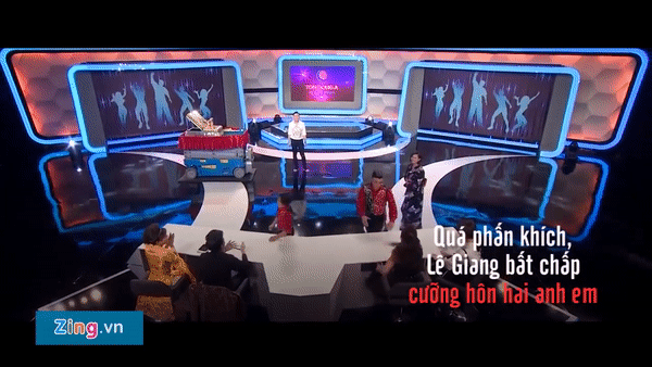 Đáp lại, Lê Giang khẳng định: "Chị thấy chương trình quá xuất sắc, ốc ác chị nổi nên phải đè người ta ra hôn". Thế nhưng Trấn Thành thẳng thừng tố cáo: "Đè thằng nhỏ ra hôn là cưng quá, mắc mớ gì chị đè thằng lớn ra hôn luôn" khiến trường quay được phen cười vỡ bụng.
