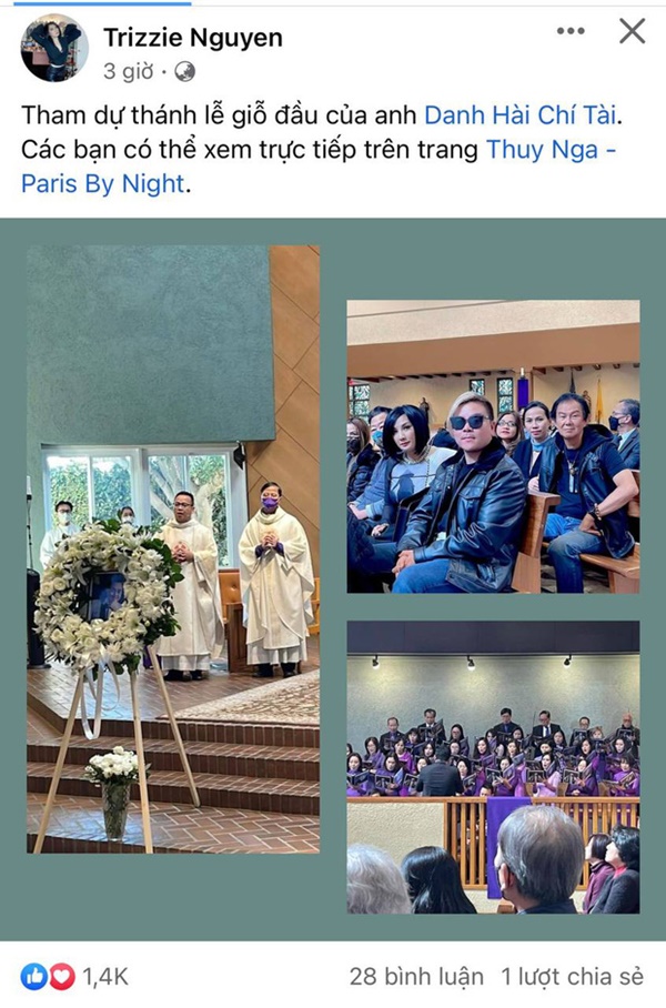Đã 1 năm kể từ ngày nghệ sĩ Chí Tài rời xa trần thế nhưng khán giả và bạn bè, người thân vẫn chưa nguôi nỗi nhớ. Vừa qua, anh trai Chí Tài - nghệ sĩ Chí Thiện đã chia sẻ thông tin về buổi lễ giỗ đầu của cố nghệ sĩ tại Mỹ. Theo đó, ca sĩ Phương Loan gửi lời mời đến người thân hữu, quý khán thính giả ái mộ tới tham dự thánh lễ và hiệp ý dâng lời cầu nguyện cho chồng quá cố.