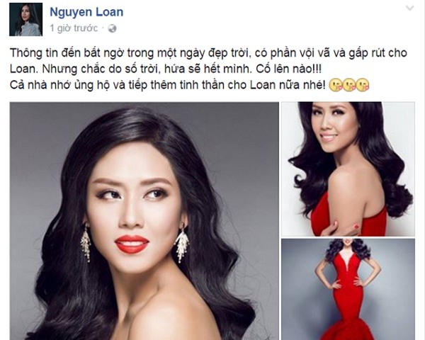 Nhưng vào ngày hôm nay 28/9, Nguyễn Thị Loan đã chính thức xác nhận sẽ tham dự cuộc thi Hoa hậu Hòa bình Quốc tế 2016, chứ không phải là Hoa hậu Hoàn vũ. Trang fanpage của Hoa hậu Hòa bình cũng vừa đăng tin xác nhận Nguyễn Thị Loan sẽ chính thức đại diện Việt Nam tham dự cuộc thi của họ.