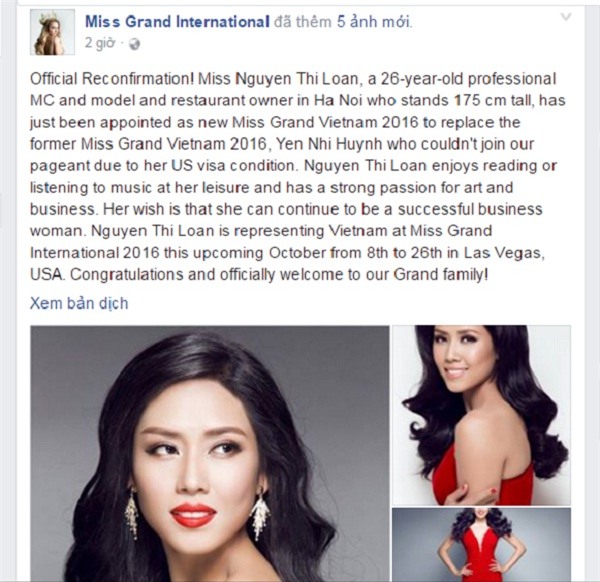 Trang chủ Miss Grand Internationnal và Nguyễn Thị Loan đều xác nhận thông tin này.