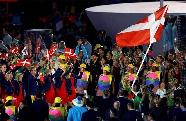08h25: Tay vợt Caroline Wozniacki cầm cờ cho đoàn thể thao Đan Mạch tiến vào sân. Họ có 121 vận động viên tranh tài ở 16 nội dung tại Olympics 2016.