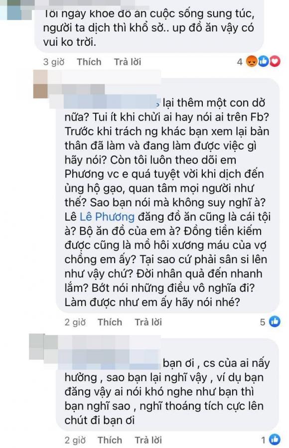 Ngay sau đó, một tài khoản mạng mắng nữ diễn viên: "Hãy như anh Quyền Linh và chị Việt Hương, lúc này dân thì đói mà lúc nào cũng ăn và uống, không ngại hả em?". Trước lời mỉa mai của anti-fan, nữ diễn viên đáp trả nhẹ nhàng nhưng khá sâu cay: "Bình thường Phương lao động vất vả lắm, giờ có thời gian chăm sóc gia đình và bản thân bằng đồng tiền xương máu của mình nên thấy rất bình yên. Phương chỉ ngại cho những ai lười biếng, hồ đồ, cứ thích chê bai, chỉ trích người khác thôi".
