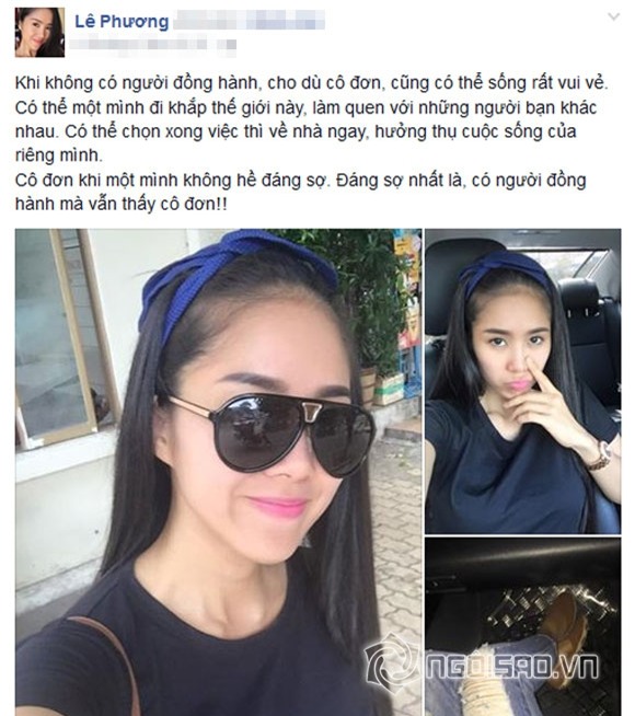 Trước đó, trên trang cá nhân, diễn viên "Cá rô, anh yêu em" tâm sự: "Khi không có người đồng hành, cho dù cô đơn, cũng có thể sống rất vui vẻ. Có thể một mình đi khắp thế giới này, làm quen với những người bạn khác nhau. Có thể chọn xong việc thì về nhà ngay, hưởng thụ cuộc sống của riêng mình. Cô đơn khi một mình không hề đáng sợ. Đáng sợ nhất là, có người đồng hành mà vẫn thấy cô đơn!". Sau khi đăng tải, rất nhiều khán giả đã động viên cô vượt qua những khó khăn trước mắt để chăm lo tốt cho bé Cà Pháo.