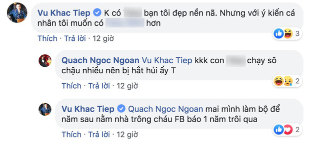 Trong một bài đăng khác của Quách Ngọc Ngoan cách đây ít giờ, Vũ Khắc Tiệp và nam diễn viên này tương tác với nhau rất vui vẻ. "Ông bầu" người Nam Định lại tiếp tục nhắc đến chuyện "trông cháu": "Mai mình làm bộ (ảnh) để năm sau nằm nhà trông cháu Facebook báo 1 năm trôi qua".