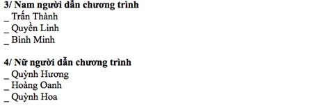 Trấn Thành, tuy không suôn sẻ ở hạng mục Nghệ sĩ hài nhưng với sở trường Người dẫn chương trình thì anh lại là người nhận được số phiếu cao nhất từ báo chí. "Tranh chấp" giải thưởng với Trấn Thành năm nay là Quyền Linh và Bình Minh. Ở giải nữ, người dẫn chương trình kỳ cựu Quỳnh Hương sẽ "đua" cùng Quỳnh Hoa và Á hậu Hoàng Oanh.