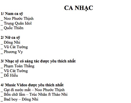 Ở hạng mục ca nhạc, Đông Nhi, Noo Phước Thịnh tiếp tục giữ vững phong độ là cái tên "bội thu" giải thưởng năm 2014 khi lọt top 3 Nam/Nữ ca sĩ được yêu thích đề cử HTV Awards 2015. Không dừng lại ở đó, Noo Phước Thịnh và Đông Nhi cho thấy sức mạnh của tuổi trẻ khi dắt tay nhau ở hạng mục Music video được yêu thích nhất với Gạt đi nước mắt và Bad boy.