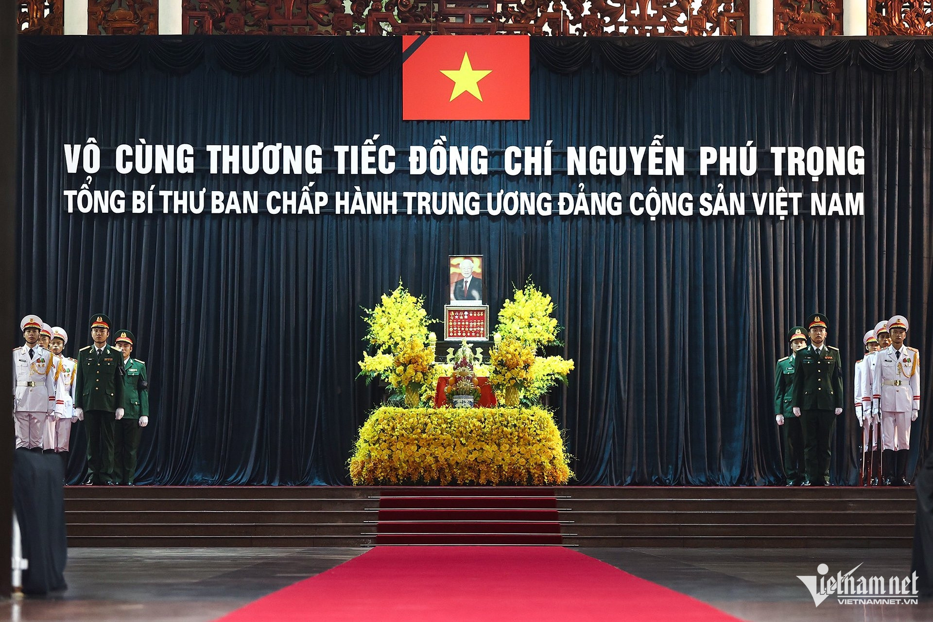 Trong nhà tang lễ, linh cữu Tổng Bí thư Nguyễn Phú Trọng đặt ở trung tâm đại sảnh, phủ quốc kỳ. Phía sau linh cữu có di ảnh cùng dòng chữ "Vô cùng thương tiếc đồng chí Nguyễn Phú Trọng - Tổng Bí thư Ban Chấp hành Trung ương Đảng Cộng sản Việt Nam".