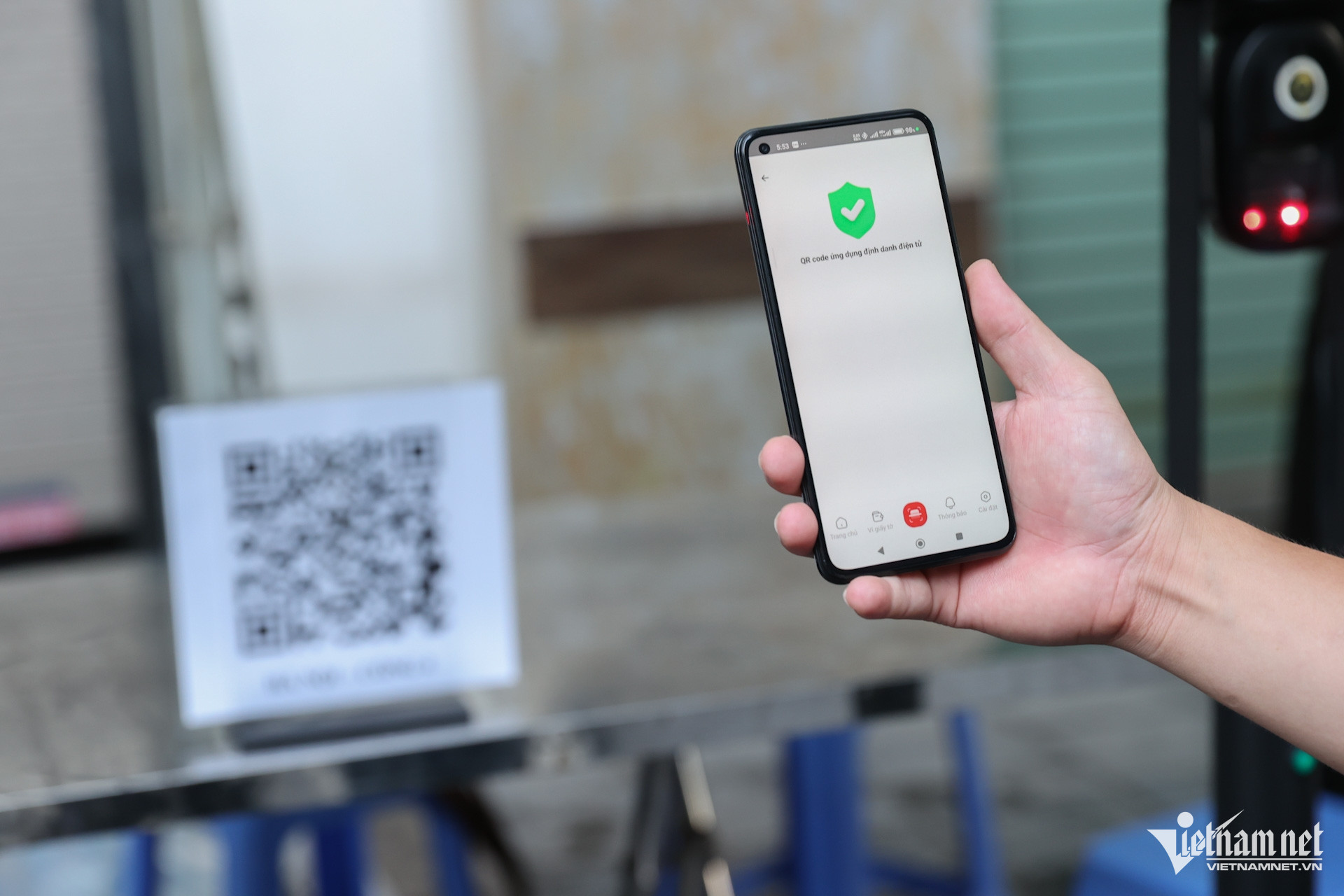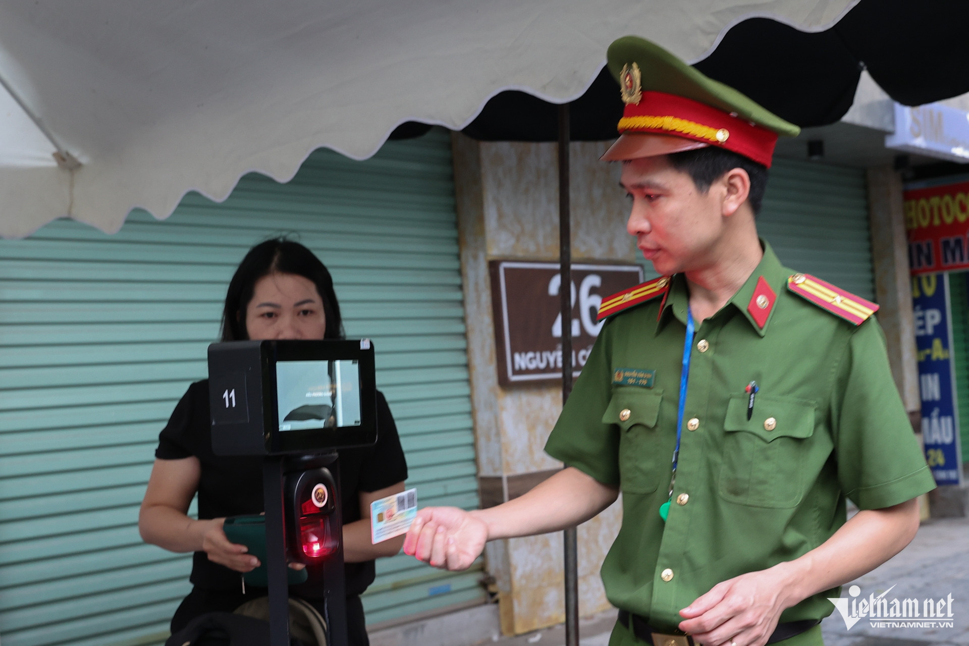 Tại chốt ngã tư Nguyễn Công Trứ - Lò Đúc được bố trí 4 máy quét 2 bên chốt để người dân vào viếng quét căn cước gắn chip.