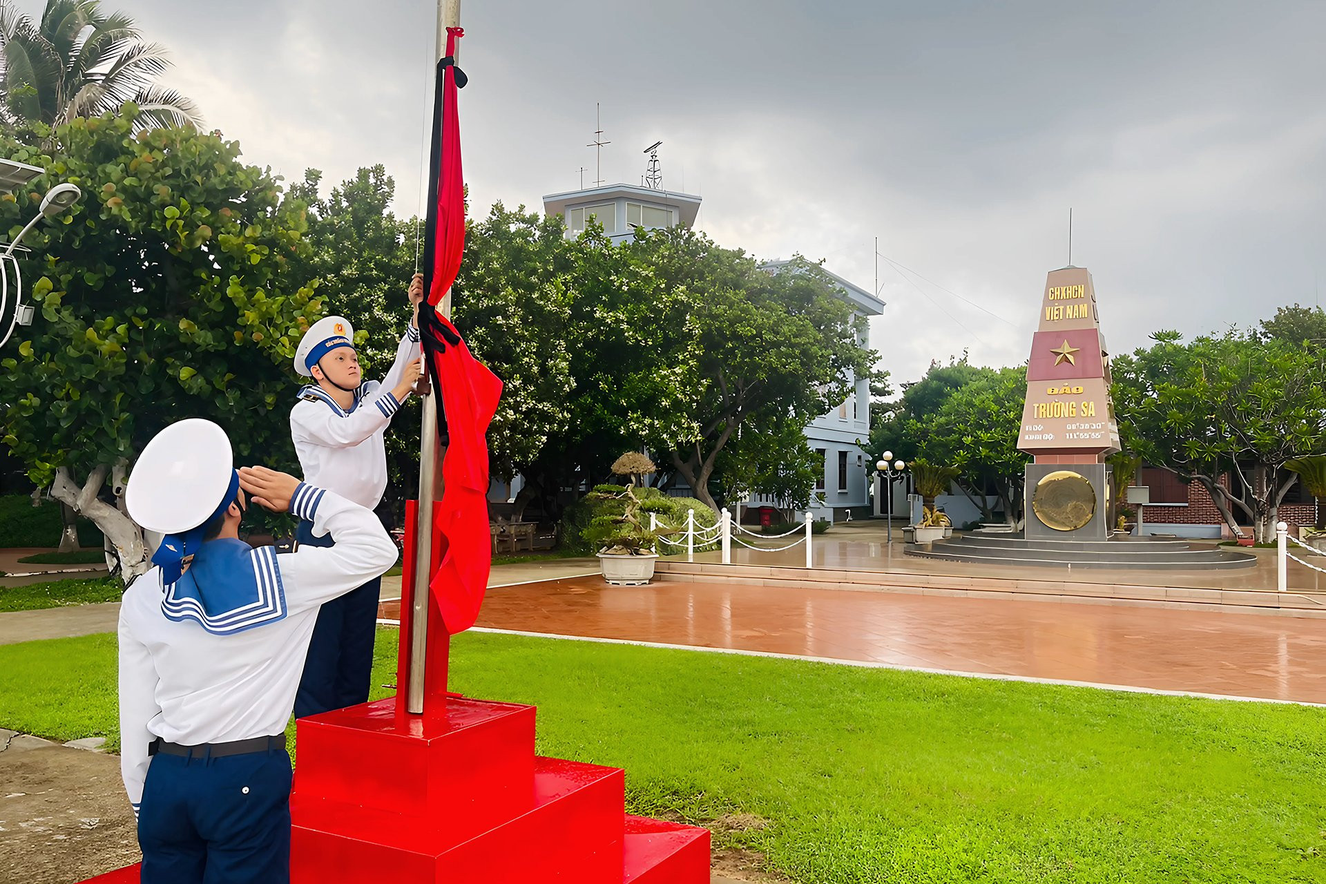 Treo cờ rủ lúc 6h tại đảo Trường Sa. Ảnh: Bộ tư lệnh Hải quân