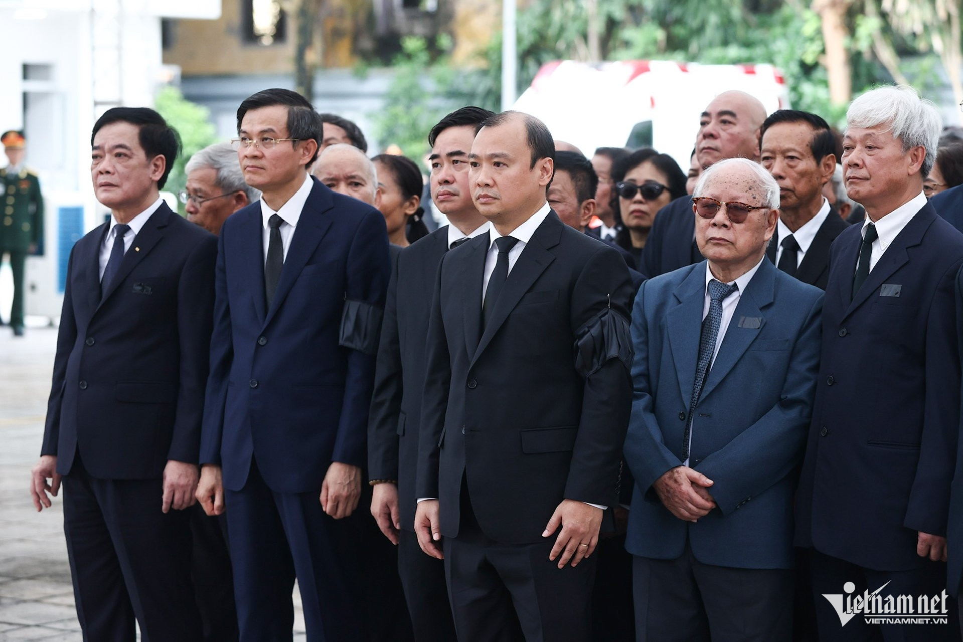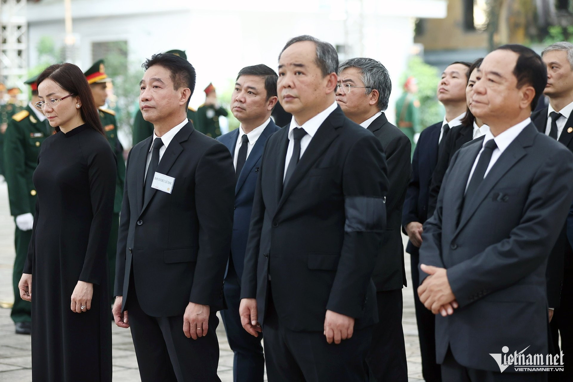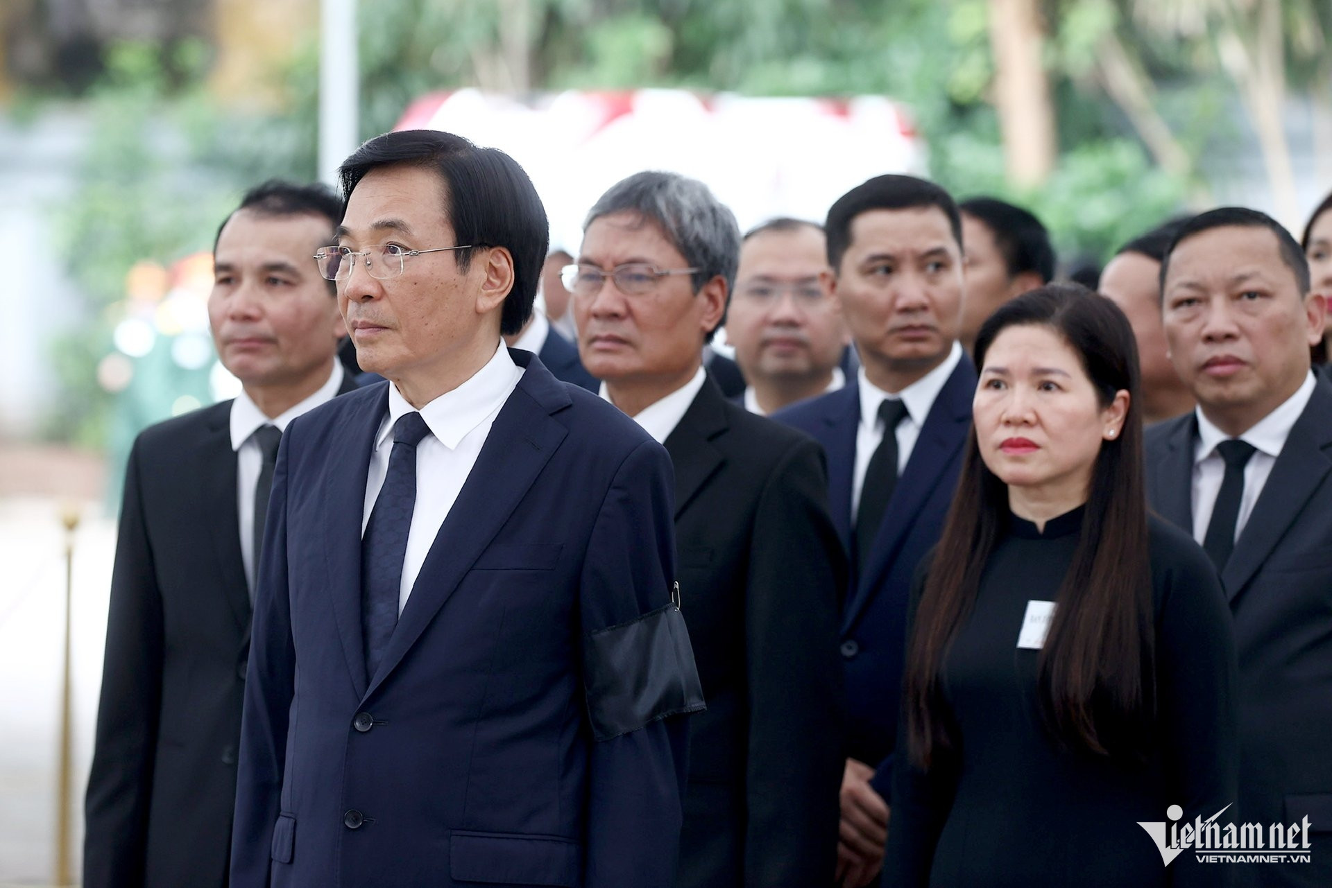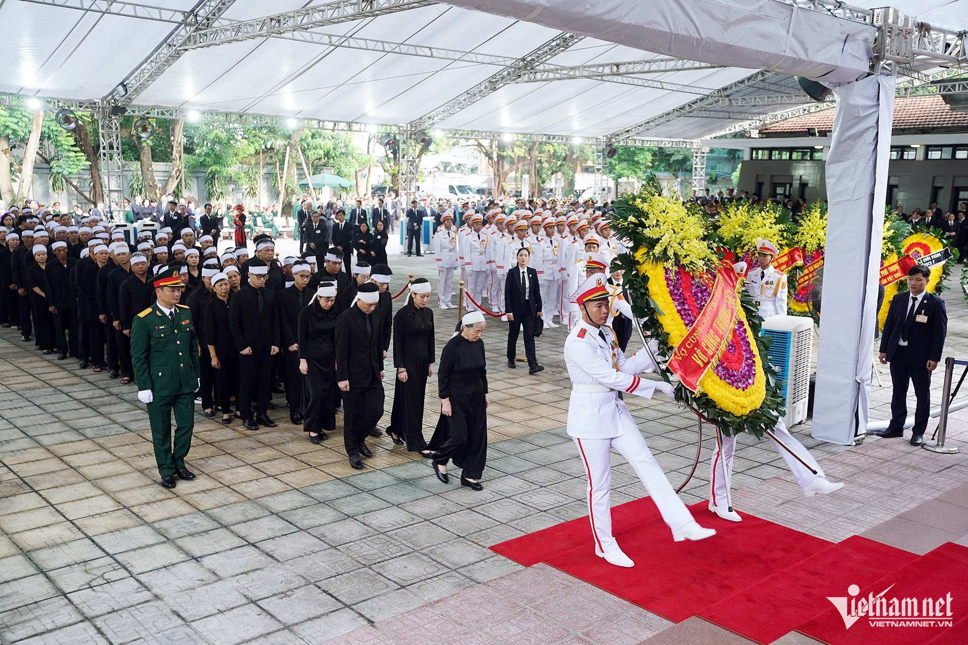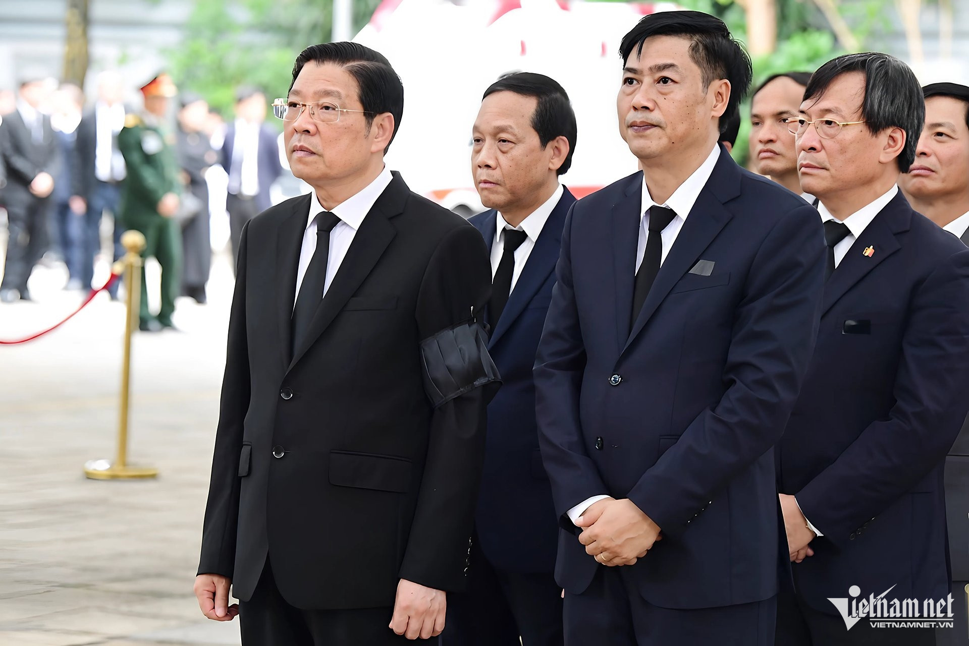 Ngoài sân nhà tang lễ, lãnh đạo Đảng, Nhà nước và gia quyến Tổng Bí thư có mặt từ sớm để chuẩn bị bắt đầu buổi lễ.
