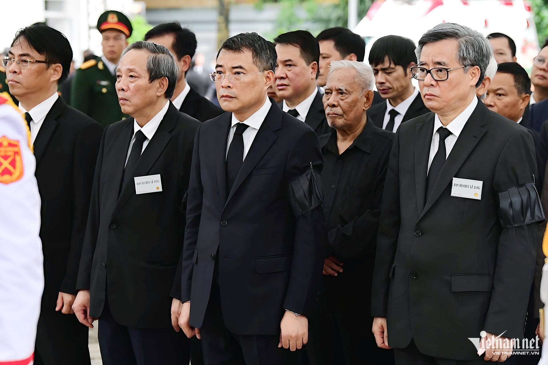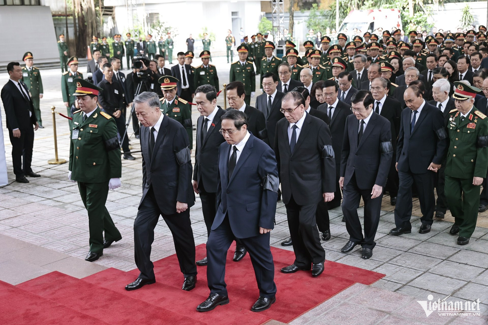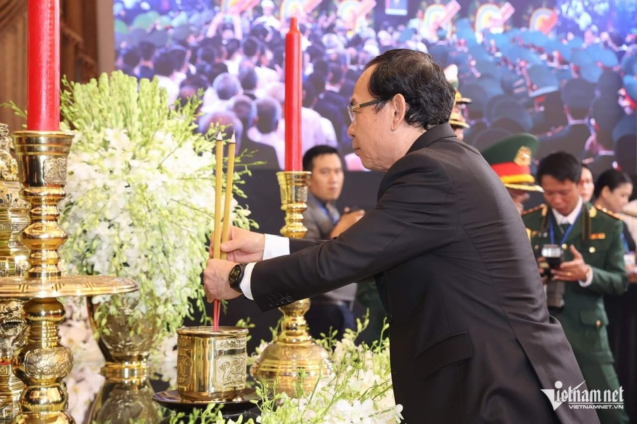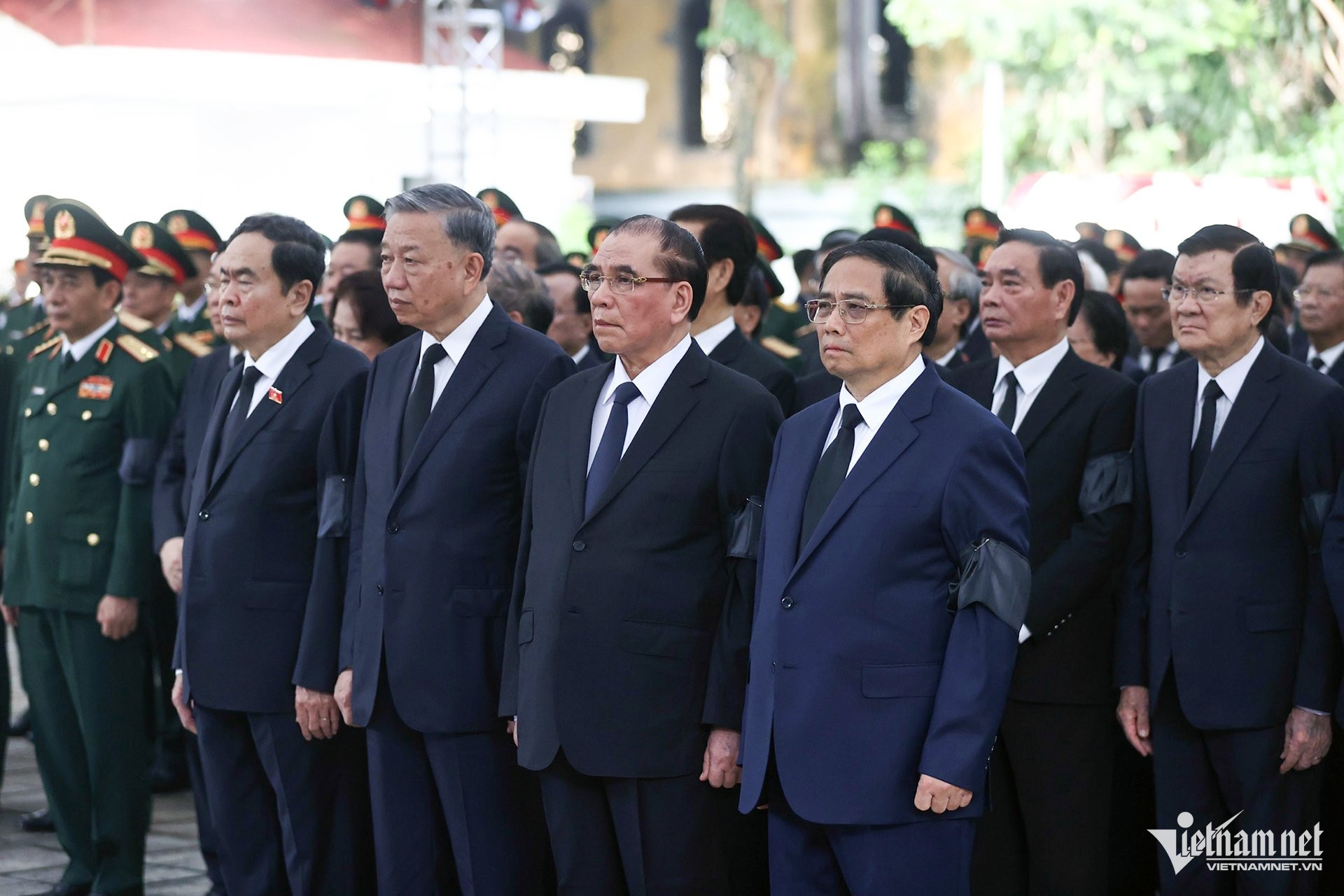 Trong đoàn có Thủ tướng Phạm Minh Chính, Chủ tịch Quốc hội Trần Thanh Mẫn; nguyên Tổng Bí thư Nông Đức Mạnh; các nguyên Chủ tịch nước: Trương Tấn Sang, Nguyễn Minh Triết, Nguyễn Xuân Phúc, Võ Văn Thưởng; nguyên Thủ tướng Nguyễn Tấn Dũng; các nguyên Chủ tịch Quốc hội: Nguyễn Sinh Hùng, Nguyễn Thị Kim Ngân, Vương Đình Huệ cùng nhiều lãnh đạo, nguyên lãnh đạo Đảng, Nhà nước.
