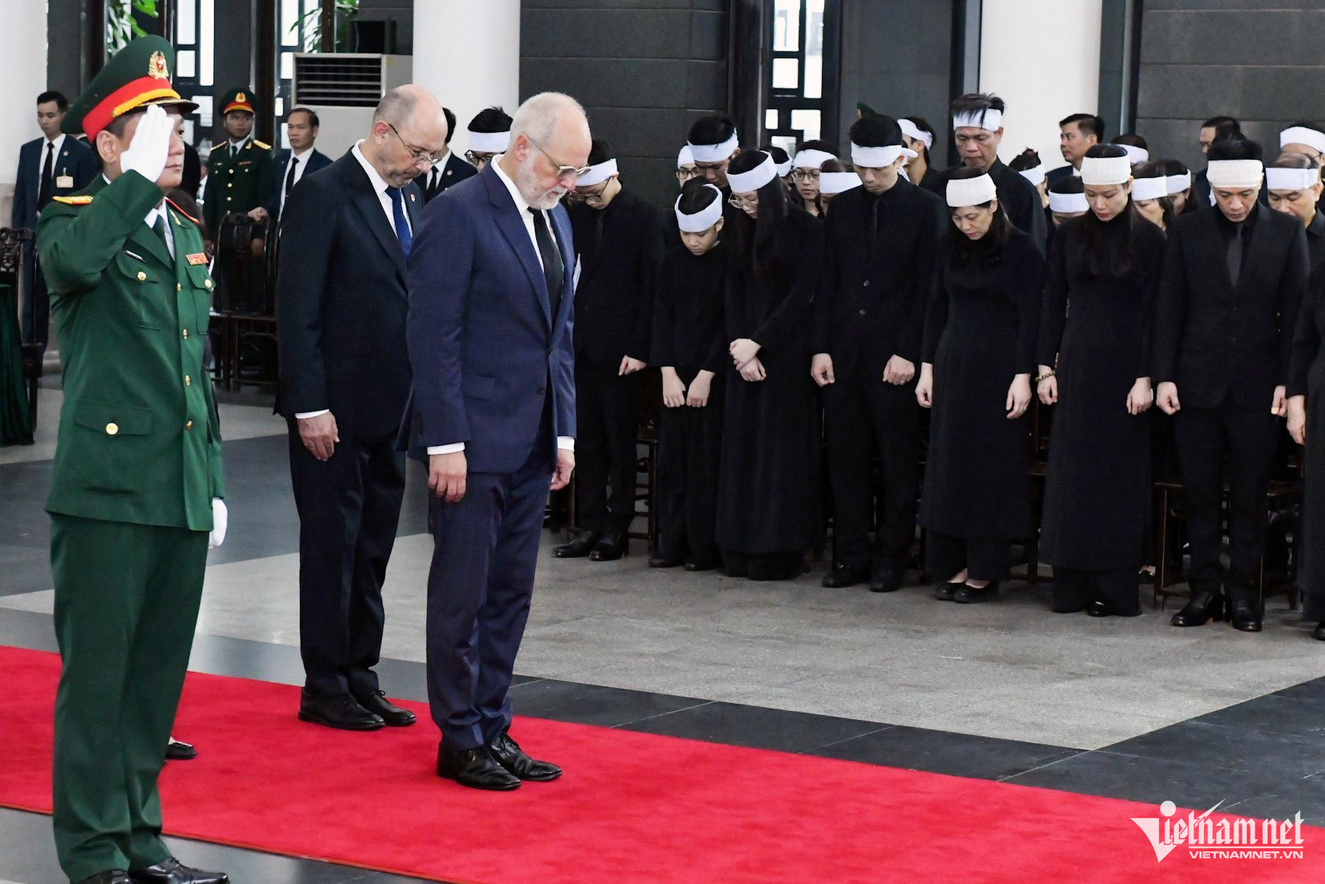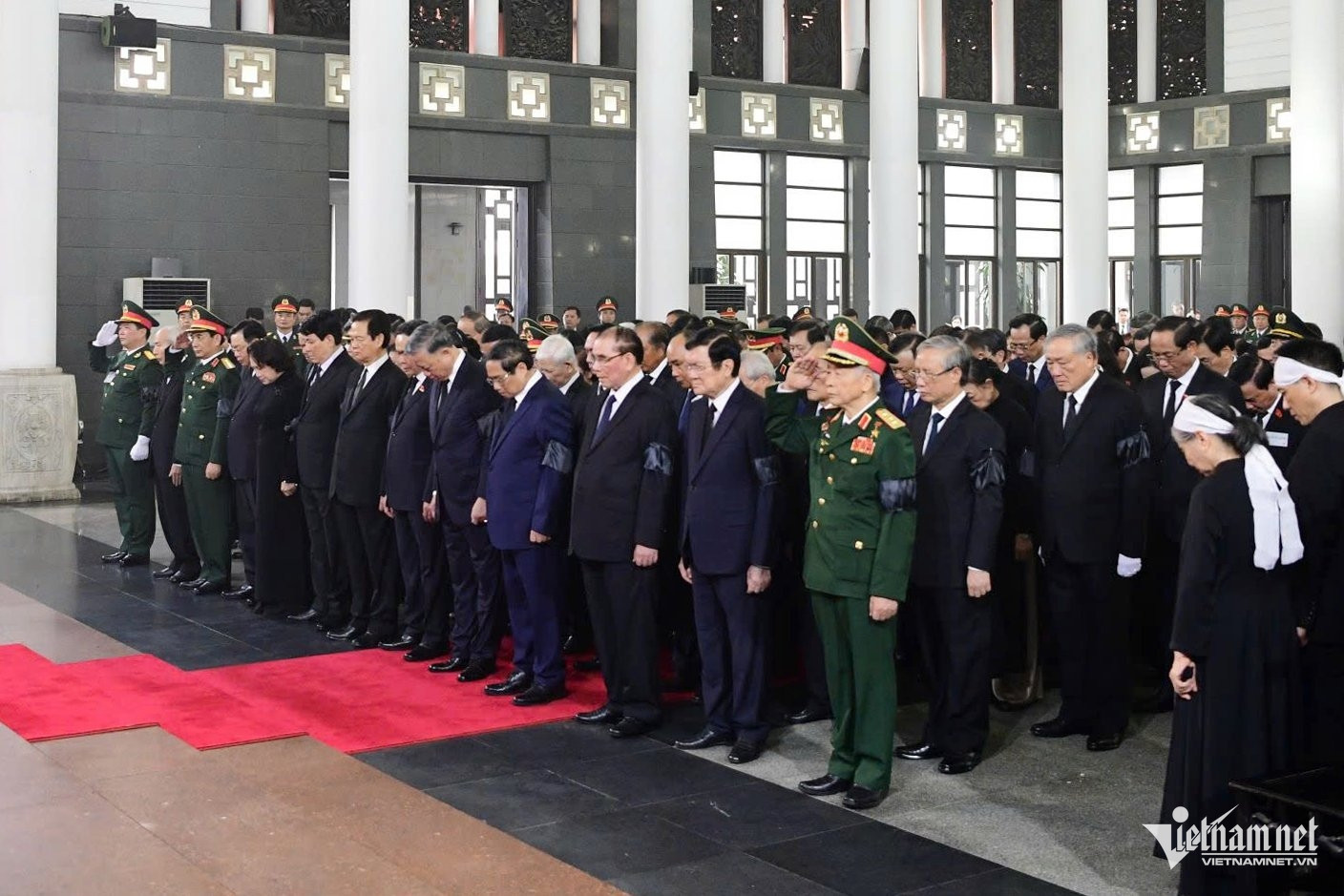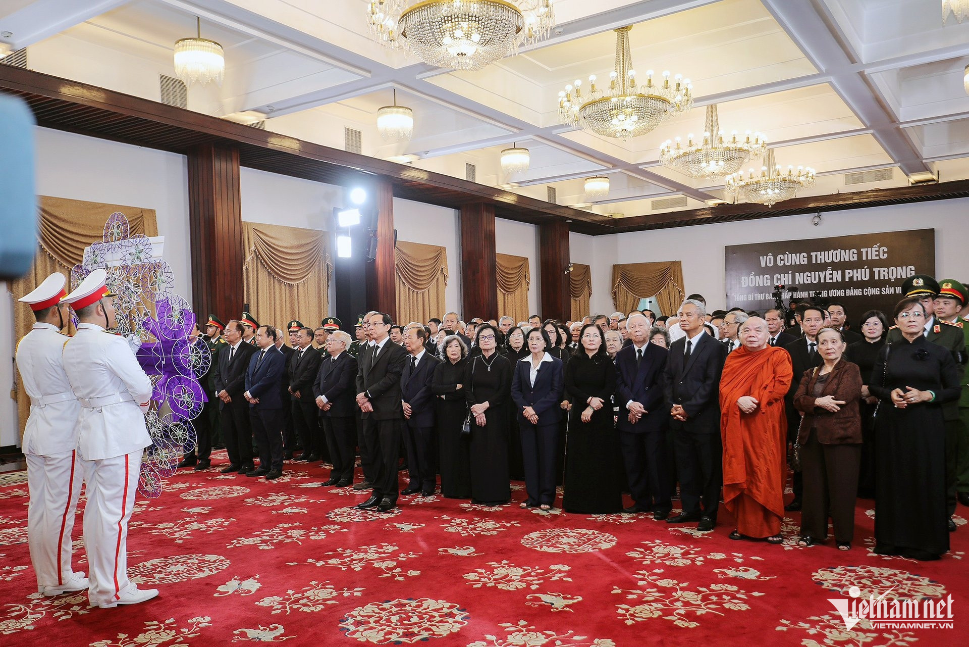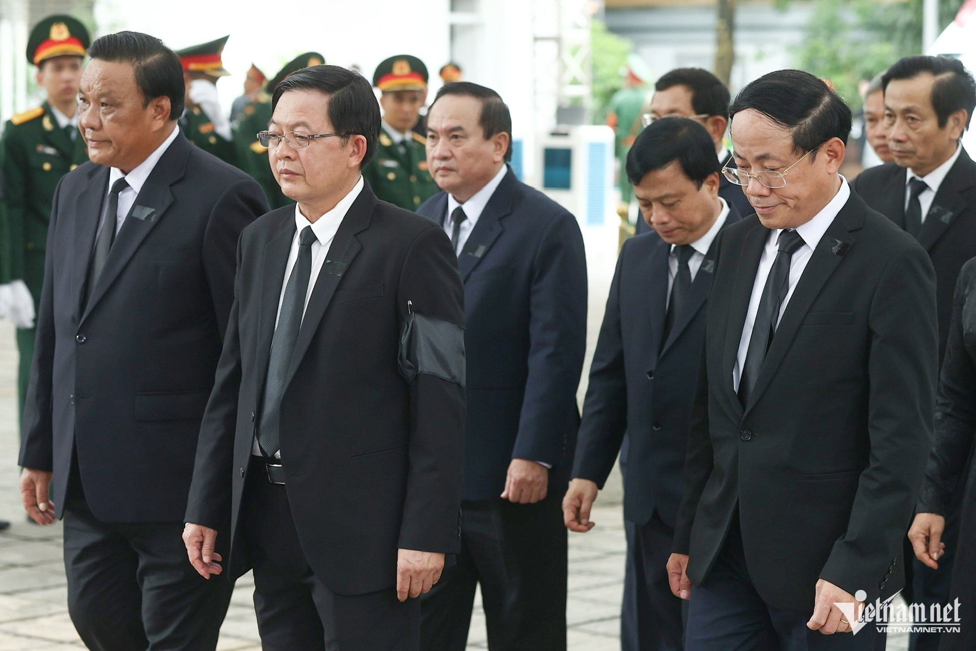 Trong đoàn có Thủ tướng Phạm Minh Chính, Chủ tịch Quốc hội Trần Thanh Mẫn; nguyên Tổng Bí thư Nông Đức Mạnh; các nguyên Chủ tịch nước: Trương Tấn Sang, Nguyễn Minh Triết, Nguyễn Xuân Phúc, Võ Văn Thưởng; nguyên Thủ tướng Nguyễn Tấn Dũng; các nguyên Chủ tịch Quốc hội: Nguyễn Sinh Hùng, Nguyễn Thị Kim Ngân, Vương Đình Huệ cùng nhiều lãnh đạo, nguyên lãnh đạo Đảng, Nhà nước.