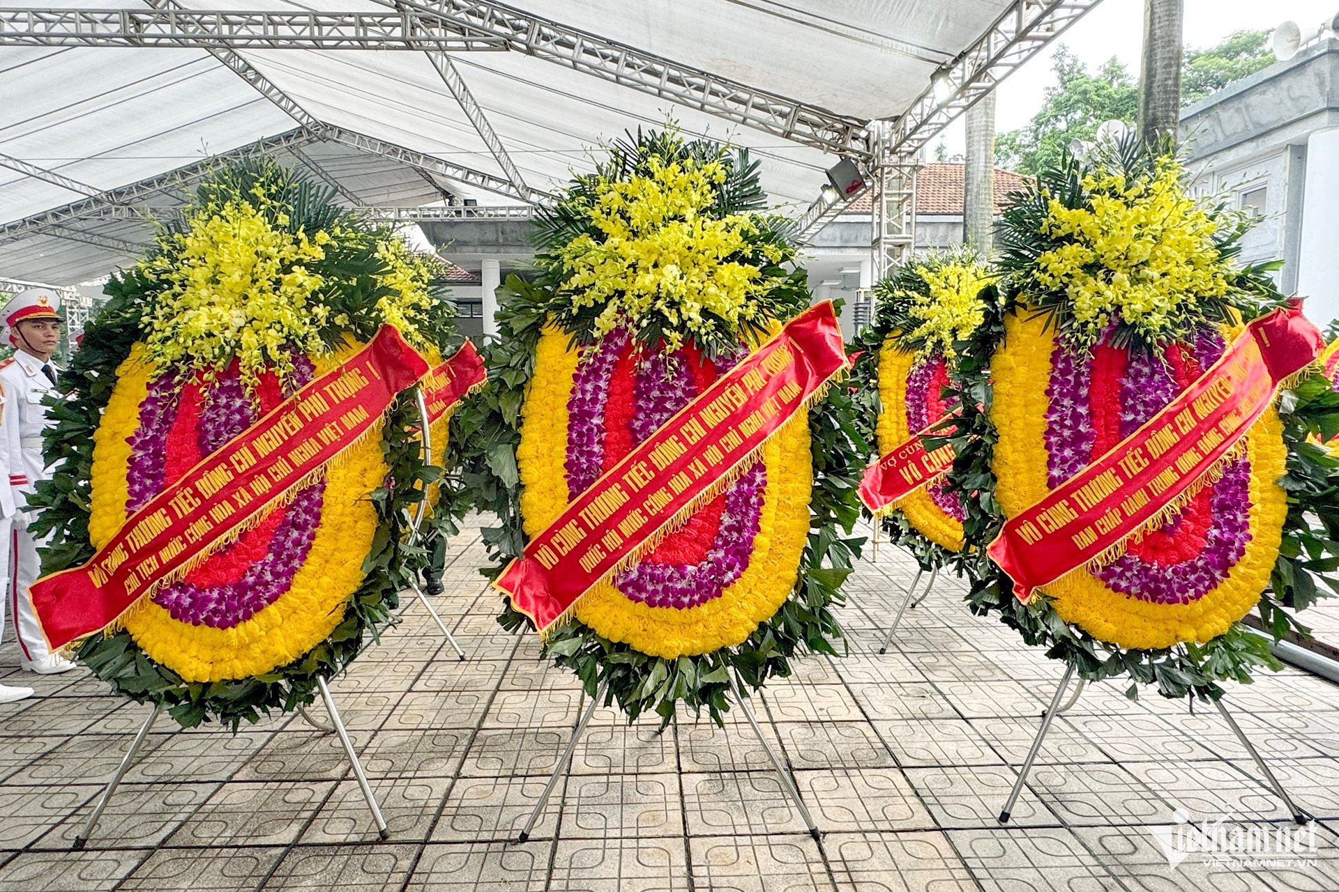 Vòng hoa của đoàn ghi dòng chữ "Vô cùng thương tiếc đồng chí Nguyễn Phú Trọng - Tổng Bí thư Ban Chấp hành Trung ương Đảng Cộng sản Việt Nam".