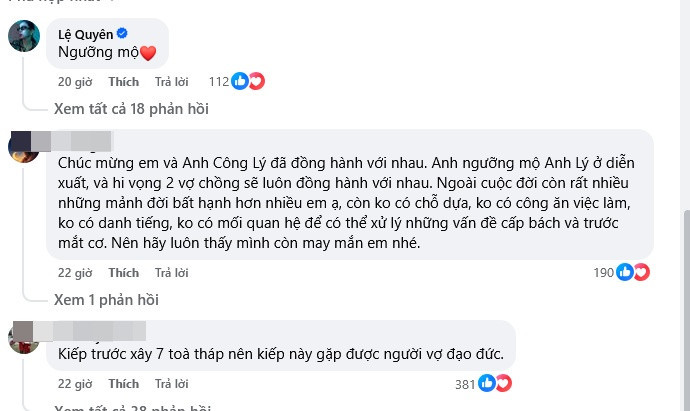 Trong đó, Lệ Quyên để lại bình luận gây chú ý: "Ngưỡng mộ".