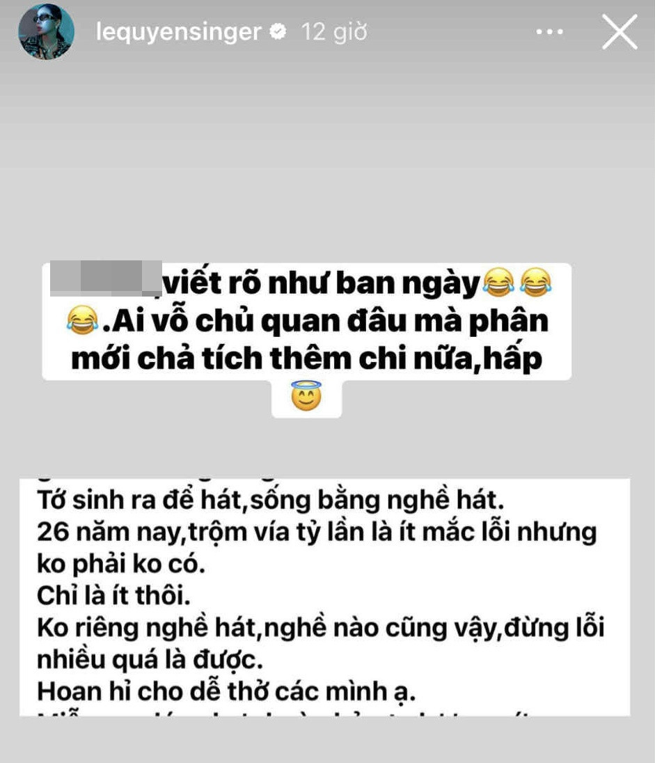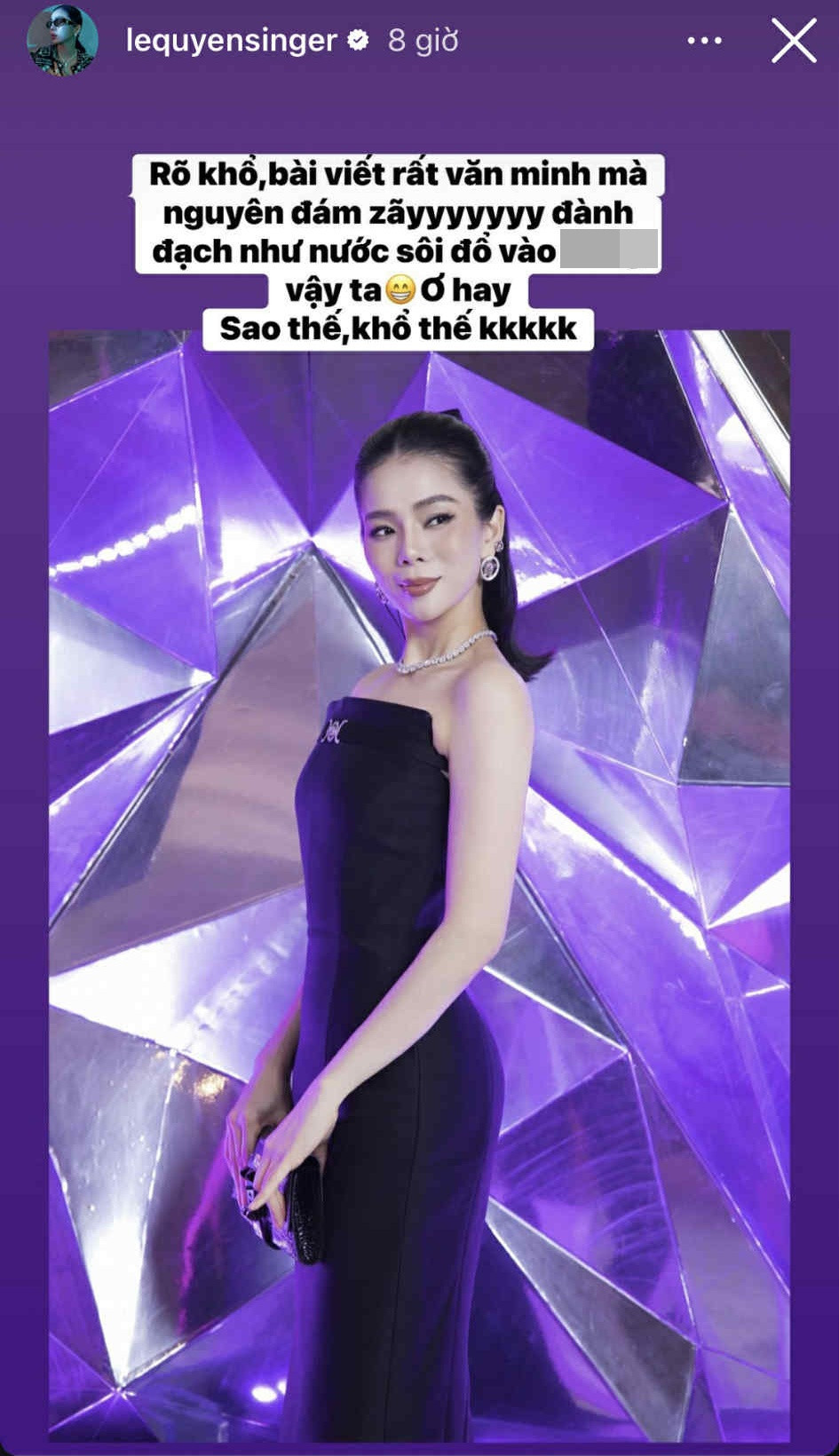 Dòng trạng thái được viết giữa thời điểm Hồ Ngọc Hà bị soi phần trình diễn hát live bị "oét" trên sân khấu thương hiệu gây bão mạng xã hội. Chính vì thé, dưới bài đăng của Lệ Quyên, nhiều cư dân mạng cho rằng nữ ca sĩ đang ẩn ý nhắc tới Hồ Ngọc Hà.