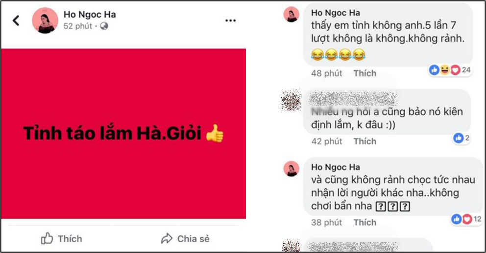 Ngay sau đó, Hà Hồ lại có động thái lạ khi trả lời một bình luận rằng: "Khoe là chụp ảnh phải giơ tai tay cổ này kia á, thôi em ơi có bằng ai đâu mà khoe làm gì, ăn ngon mình hưởng, ngủ ngon mình khỏe là vui rồi. Có điều đúng là muốn sống yên cũng khó nhỉ, ruồi muỗi quá nhiều vì cuộc sống giờ ô nhiễm quá!".