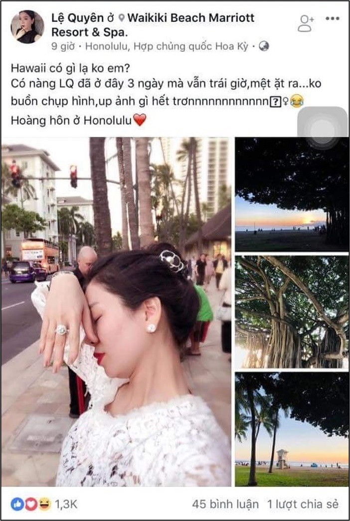 Trước đó, khi Lệ Quyên đăng tải một bức hình đưa bàn tay lên che mặt, để lộ chiếc nhẫn và đôi hoa tai kim cương của Lệ Quyên đã thu hút sự chú ý của công chúng.