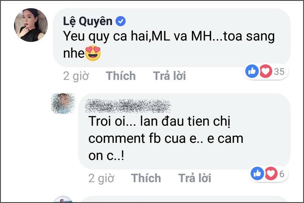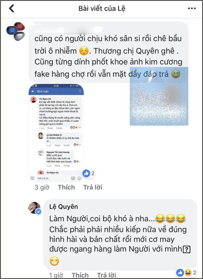 Lệ Quyên đâu có dễ dàng ngó lơ như vậy, cô nhanh chóng đáp trả sâu cay. Tuy nhiên bình luận này đã bị xóa..
