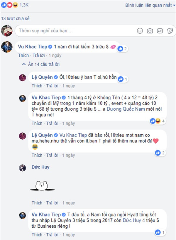 Ngoài ra, để minh chứng mình không nói sai, Vũ Khắc Tiệp tiếp tục đưa thêm thông tin từ một đại gia là bạn chơi chung của cả hai người: "Anh Dương Quốc Nam tối qua ngồi Hyatt tổng kết thu nhập Lệ Quyên 3 triệu đô trong 2017 còn Đức Huy 4 triệu đô từ Business riêng".