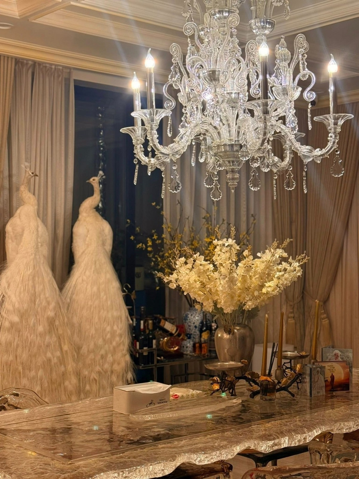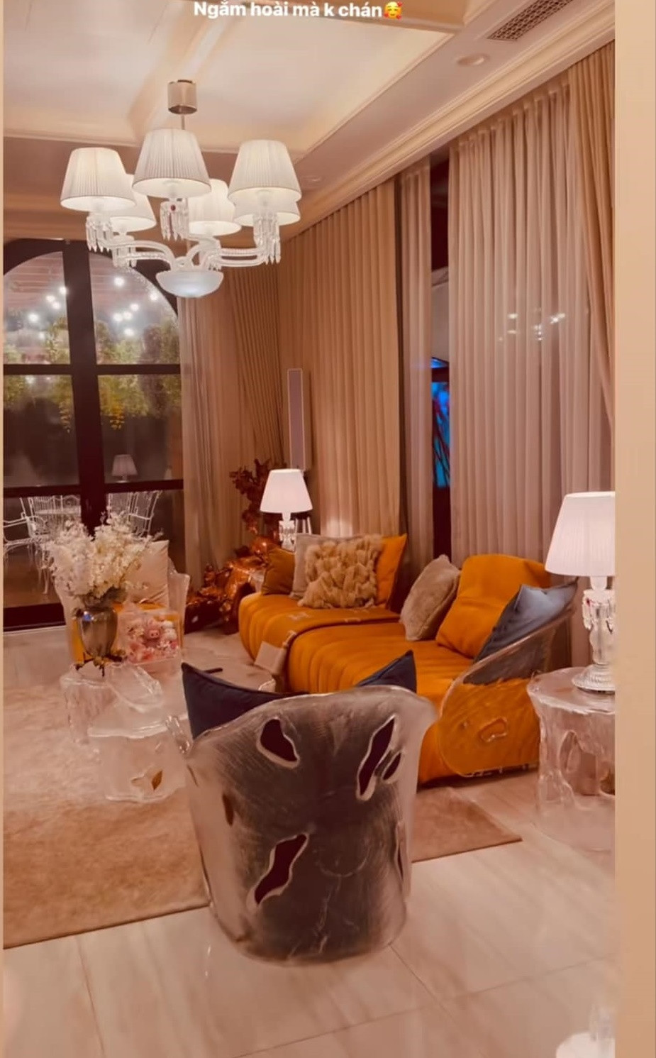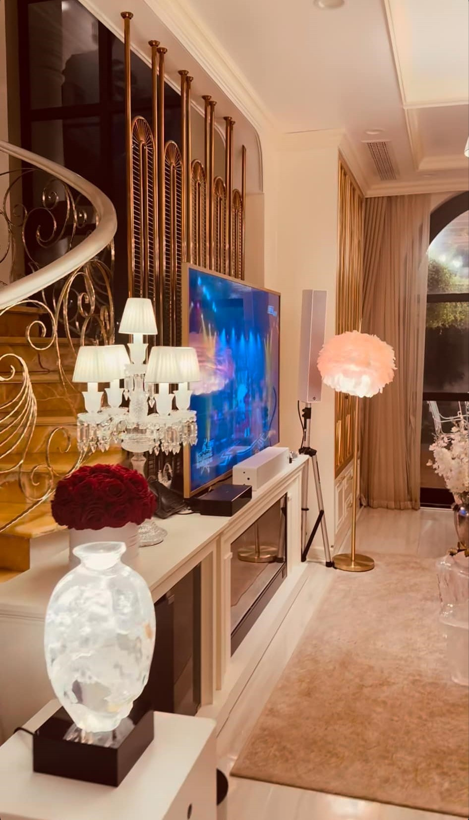 Trong đoạn clip ngắn, người tình Lâm Bảo Châu hé lộ không gian phòng khách với nội thất vô cùng lung linh. Lệ Quyên cực kì chuộng những thiết kế pha lê làm sáng trưng cả căn biệt thự và đương nhiên những món đồ này có giá không hề rẻ.