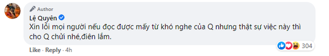 Tiếp đó, sau khi xóa bình luận, Lệ Quyên đã để lại dòng viết xin lỗi vì ngôn từ khó nghe: "Xin lỗi mọi người nếu đọc được mấy từ khó nghe của Quyên nhưng thật sự việc này thì cho Quyên chửi nhé, điên lắm". Đây cũng không phải lần đầu tiên, Lệ Quyên thẳng thắn đáp trả những bình luận của netizen.