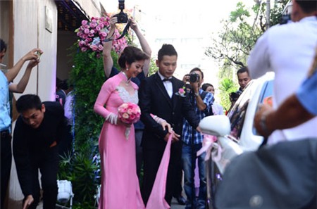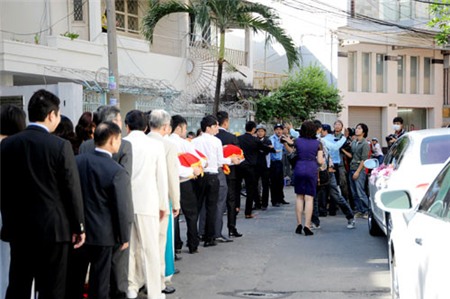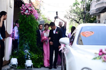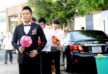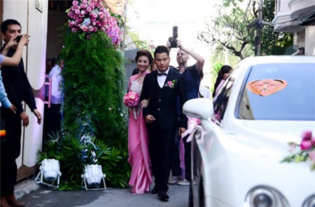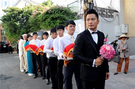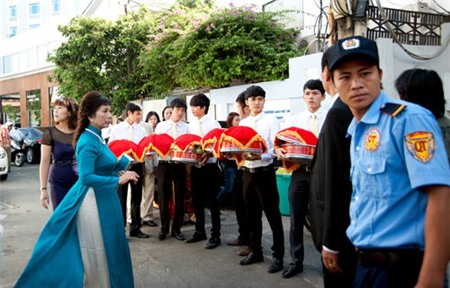 Trước khi đãi tiệc tại Trung tâm hội nghị White Palace vào tối nay, buổi sáng cùng ngày hai họ tổ chức lễ ăn hỏi và xin dâu theo đúng nghi lễ truyền thống. Khoảng 8 giờ sáng, tại khu biệt thự nằm trên đường Phổ Quang, quận Tân Bình của gia đình chú rể Nguyễn Đức Hải, mọi người đã tất bật chuẩn bị trang trí xe hoa và sính lễ để đón dâu. Dàn xế hộp chờ sẵn đến giờ khởi hành. Một đội ngũ bảo vệ cũng được sắp xếp để thắt chặt an ninh cho đám hỏi.