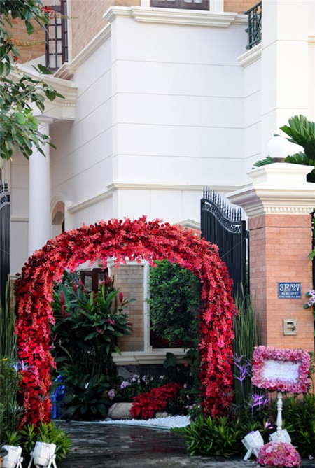 | Cổng hoa được trang trí màu đỏ tím. |
