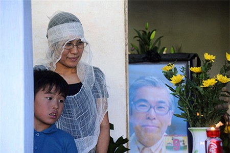 Mặc áo xô, đội mũ rơm, đeo khăn tang và chống gậy, hai cậu bé bước đi ngơ ngác khi đưa quan tài bố - tiến sĩ Nishimura Masanari - ra xe. Đám tang của nhà khoa học Nhật trưa 13/6 diễn ra đúng theo nghi thức của người Việt.