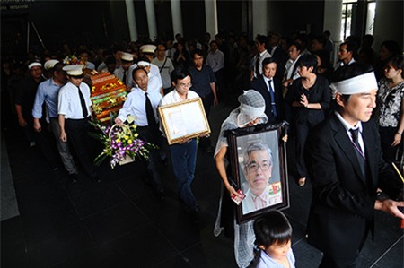Phía góc phòng, bạn bè thân thiết, đồng nghiệp hay những người yêu mến tấm lòng, tài năng của một nhà khoa học Nhật yêu Việt Nam đứng dựa vào nhau khóc. Họ cùng kể cho nhau nghe những câu chuyện giản dị về nhà khảo cổ đậm chất Việt, về tâm huyết và đóng góp của ông với ngành khảo cổ Việt Nam và về cả hai cậu bé còn quá nhỏ sớm phải chịu cảnh mồ côi cha. Không chỉ Đại sứ quán Nhật Bản tại Việt Nam, các viện, hội nghiên cứu ở Hà Nội, nhiều đoàn đến từ Nam Định, Hội An hay Huế cũng mang vòng hoa tới chia buồn cùng gia đình.