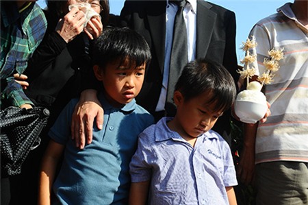 Còn quá nhỏ, bé Suhao và Susu dường như chưa hiểu chuyện gì đang diễn ra. Cả hai ngơ ngác nhìn những người mặc đồ đen, mắt đỏ hoe tới an ủi mẹ và xoa đầu chúng. Khác với anh lớn luôn đứng bên mẹ, cậu nhỏ chỉ muốn cởi đồ tang ra để đi tìm đồ chơi. Chỉ khi được cho chơi điện tử trên điện thoại, cậu bé mới chịu ngồi yên một chỗ. Nếu có ai hỏi và ôm cậu vào lòng, Susu cười tinh nghịch rồi lúc nói tiếng Việt, tiếng Anh hoặc tiếng Nhật. Nhìn cậu, những người đến dự đám tang không khỏi xót xa.