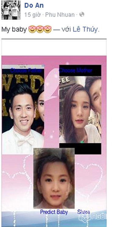 Lê Thúy hiện đang sống hạnh phúc viên mãn bên chồng Việt kiều Đỗ An kể từ sau khi kết hôn hồi tháng 1/2015. Mới đây, chồng Lê Thúy khoe hình ảnh dự đoán con tương lai. Bằng cách ghép hình ảnh của vợ và chồng, rồi dùng phần mềm để tạo ra hình ảnh của em bé. Bức ảnh cho thấy, bé có nét đẹp của cả Lê Thúy và Đỗ An, nhìn rất dễ thương.