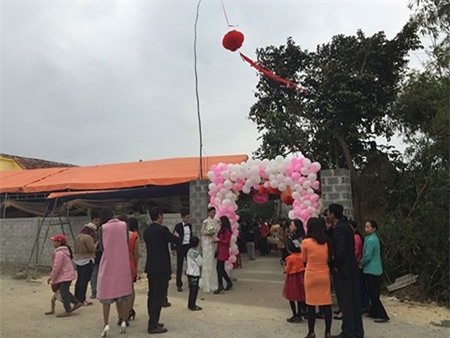 Sau lễ ăn hỏi của chân dài Next Top Model và bạn trai Đỗ Khải An tại quê nhà cô dâu - Quảng Bình, ngày 31/12, lễ cưới của cặp đôi được tổ chức ngay tại tư gia nhà cô dâu. Khung cảnh bên ngoài tiệc cưới của Lê Thúy khá đơn giản. Cổng tiệc được trang trí hết sức đơn sơ như những đám cưới thông thường tại thôn quê. Trong ảnh, nữ người mẫu cùng chồng đứng trước cổng đón khách. |