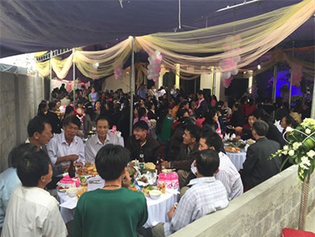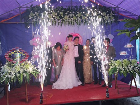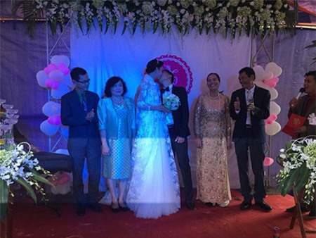 Đám cưới Lê Thúy được tổ chức ngay trong sân nhà gia đình cô dâu vì thế không gian vừa đủ cho lượng khách mời thân thiết của gia đình họ nhà gái tại quê nhà. Một số bạn bè thân của cô dâu từ TP.HCM về dự tiệc mừng. |