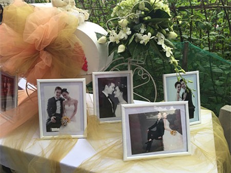 Tiệc cưới của cô dâu Lê Thúy cũng được trang trí đơn giản bằng những khung ảnh cưới của đôi vợ chồng trẻ. |