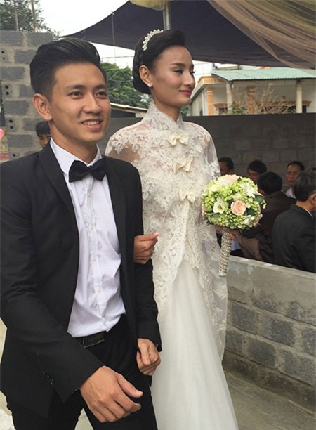 Cô dâu Lê Thúy diện trang phục váy cưới do nhà thiết kế Đỗ Mạnh Cường tặng riêng làm quà trước hôn lễ. |