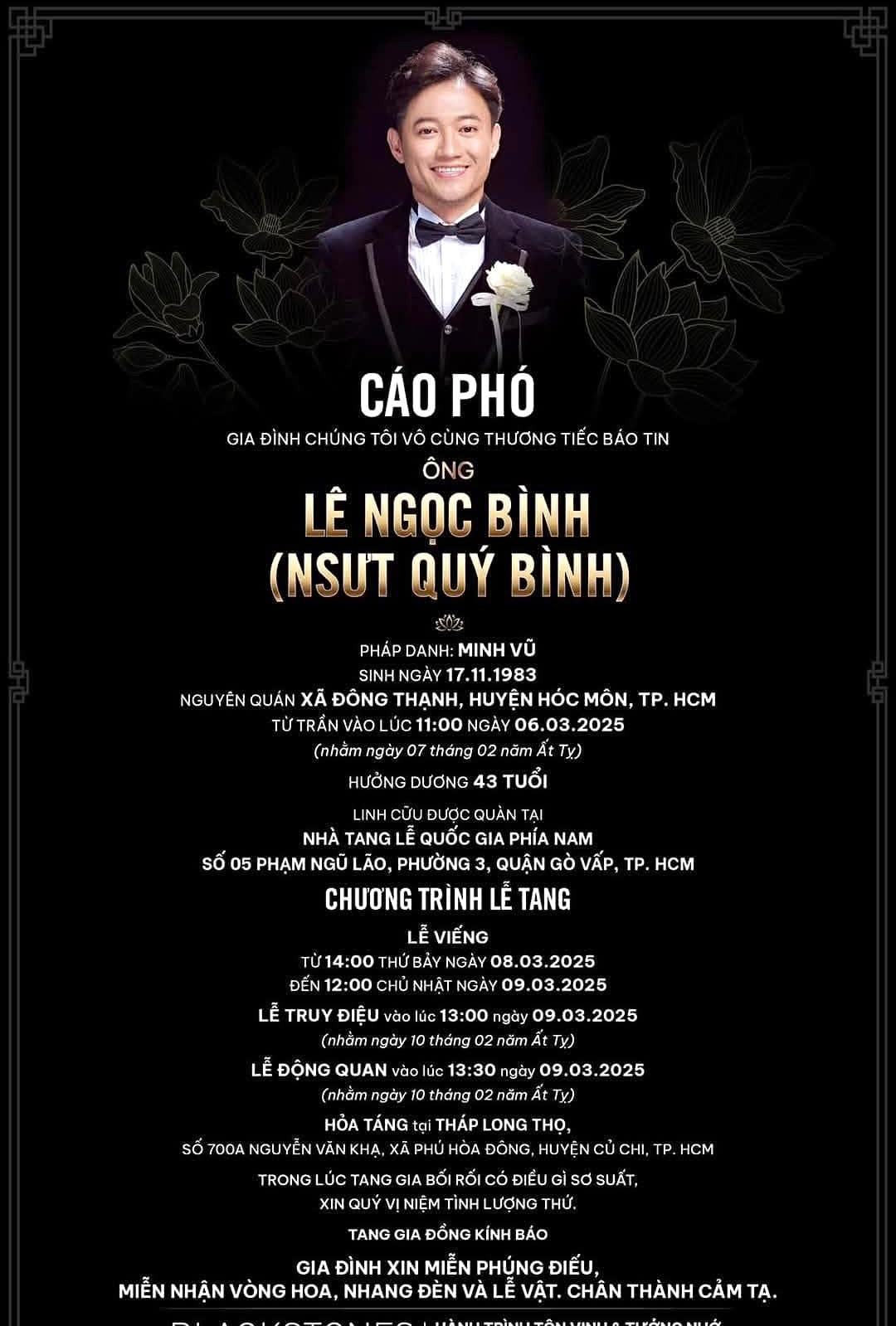 11h ngày 6/3, nghệ sĩ ưu tú Quý Bình qua đời sau thời gian dài chóng chọi với bệnh tật. Sự ra đi đột ngột của nam diễn viên tài hoa khiến nhiều đồng nghiệp, khán giả bàng hoàng và thương tiếc. Để tạo điều kiện cho người hâm mộ và bạn bè có thể đến thắp hương, tiễn biệt người quá cố thì gia đình nghệ sĩ Quý Bình tổ chức lễ viếng vào 2 ngày 8/3, 9/3 tại Nhà tang lễ Quốc gia phía Nam, địa chỉ số 05 Phạm Ngũ Lão, phường 3, quận Gò Vấp, TP.HCM.