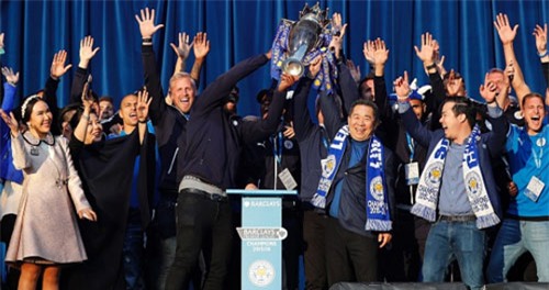 Ranieri bên chiếc cúp vô địch, hai bên là cha con nhà tỷ phú Vichai Srivaddhanaprabha