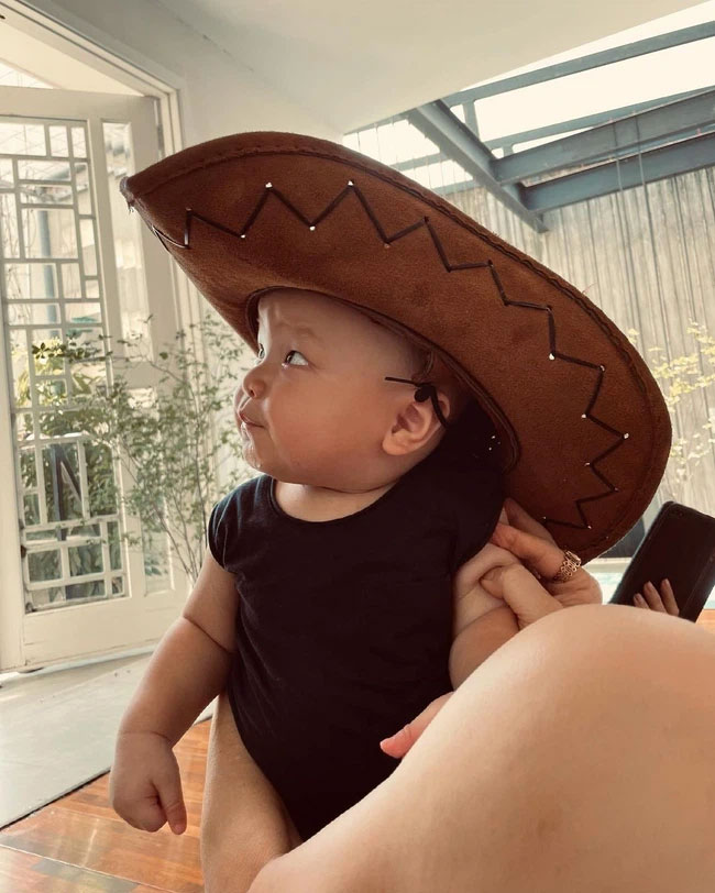 Nữ ca sĩ cũng chia sẻ khoảnh khắc con trai Leon đội một chiếc mũ cao bồi "cỡ bự" vô cùng ngộ nghĩnh kèm dòng trạng thái: "Chuẩn bị đi làm vườn các bác ạ".