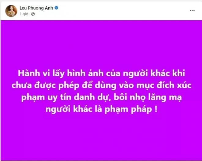 Cuộc chiến giữa Lều Phương Anh và con gái của bạn trai cô vẫn chưa có dấu hiệu hạ nhiệt. Vào sáng nay (22/5), cô gái tên T.A.T lại đăng đàn thách thức nữ ca sĩ. Nguyên nhân là vì vài giờ trước, Lều Phương Anh đăng dòng trạng thái đòi kiện đối phương: 'Hành vi lấy hình ảnh của người khác khi chưa được phép để dùng vào mục đích xúc phạm uy tín, danh dự, bôi nhọ, lăng mạ người khác là phạm pháp'. Lều Phương Anh khẳng định đã lưu lại hết những bằng chứng để làm vi bằng nhưng cô không chỉ đích danh ai trong những chia sẻ của mình.