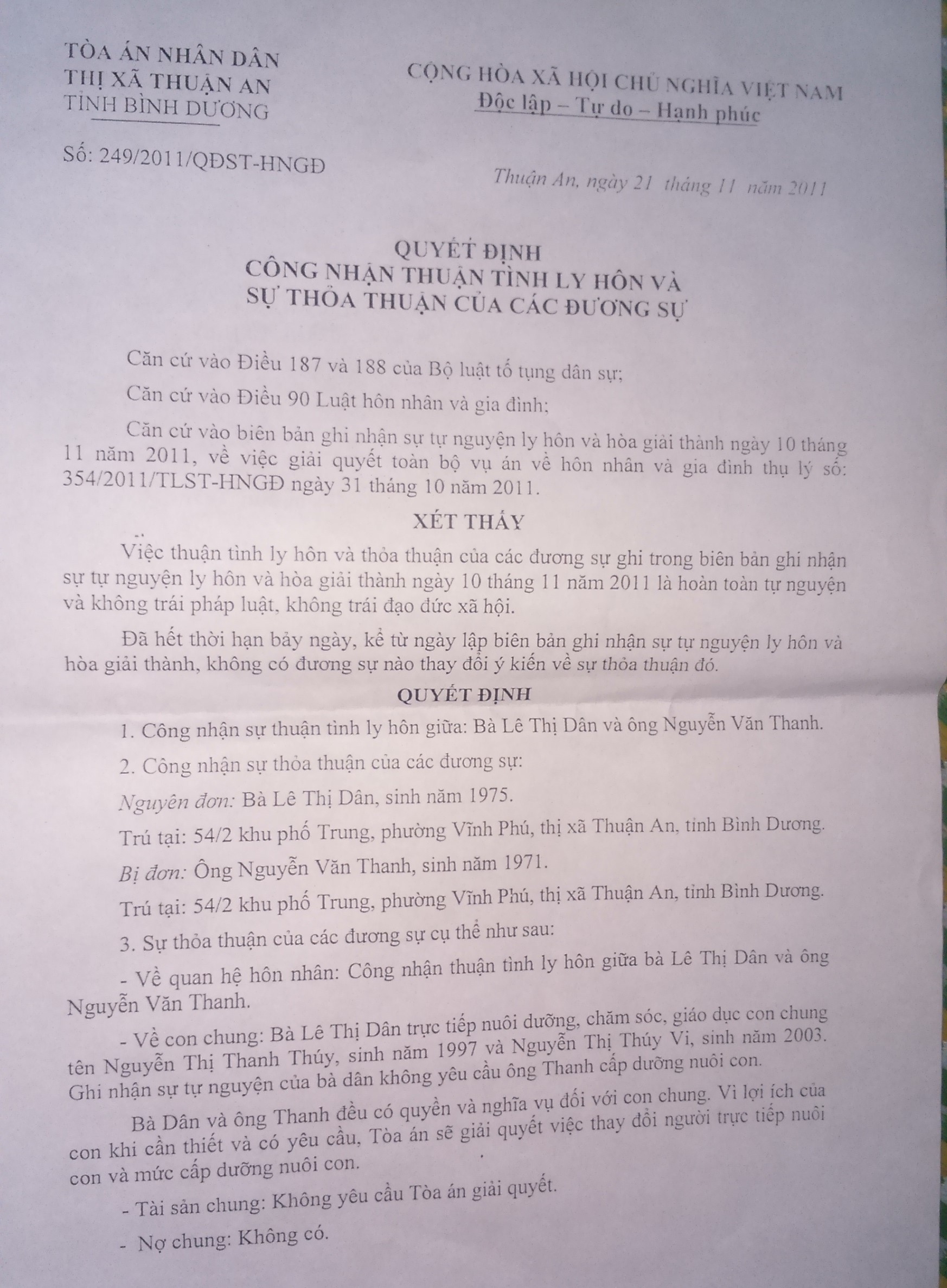 Gần 10 năm bị người chồng có tính “trăng hoa” bạo hành, chị Lê Thị Dân (SN 1975, ngụ 54/2 khu phố Trung, phường Vĩnh Phú, thị xã Thuận An, Bình Dương) buộc phải viết đơn li hôn. Thế nhưng, ngay cả khi đã đường ai nấy đi thì chồng cũ là Nguyễn Văn Thanh vẫn đánh ghen và uy hiếp vợ cũ.