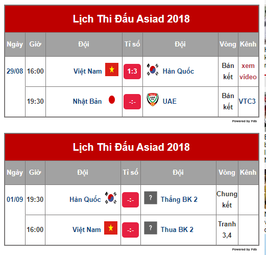 Xn gửi tới quý độc giả lịch thi đấu, kết quả vòng trận chung kết và tranh HCĐ bóng đá nam Asiad 18.