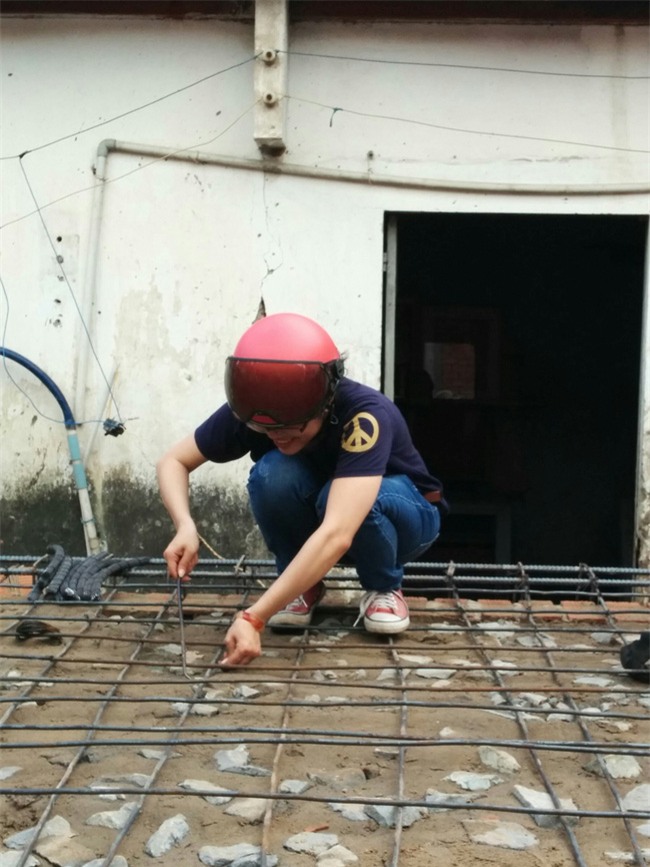 C đang ngồi bó thép, phụ giúp xây nên căn nhà mà chị hằng mơ ước