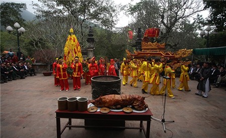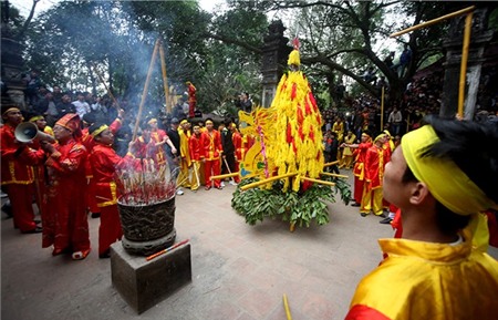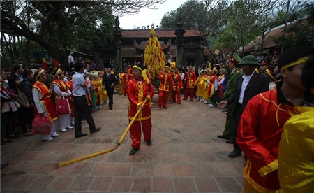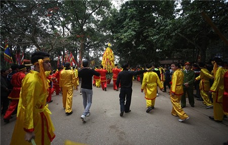 được rước bằng kiệu xuống đền Trình để làm lễ, đi bên ngoài là đội bảo