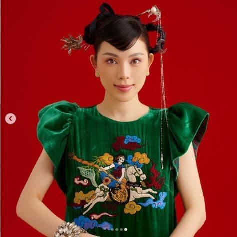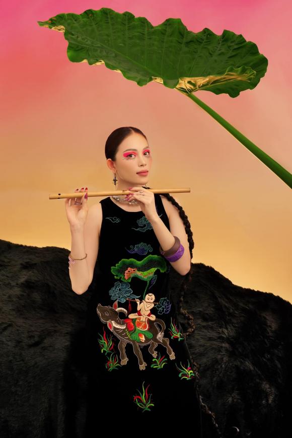 Trang phục mà bạn gái Phillip Nguyễn diện lấy cảm hứng từ những bức tranh Đông Hồ.