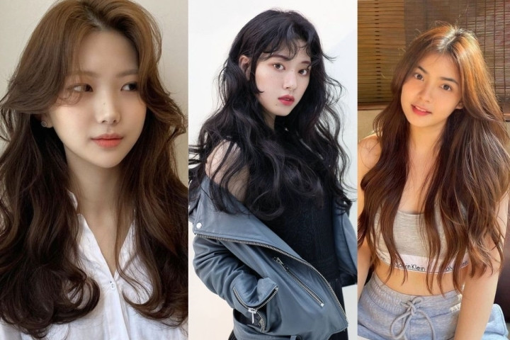 Kiểu tóc uốn gợn sóng mái thưa, để vạt mái dài ra che hai bên cằm giúp cô nàng mặt vuông xinh xắn, dễ chịu.