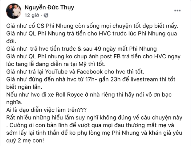Theo đó, ông viết: 'Giá như cố NS Phi Nhung còn sống, mọi chuyện tốt đẹp biết mấy. Giá như quản lý Phi Nhung trả tiền cho Hồ Văn Cường trước lúc Phi Nhung qua đời. Giá như trả Hồ Văn Cường tiền trước & sau 49 ngày mất Phi Nhung. Giá như quản lý Phi Nhung không chụp ảnh đăng Facebook trả tiền cho Hồ Văn Cường ngay lúc tang lễ đang diễn ra tại Mỹ thì tốt…'.