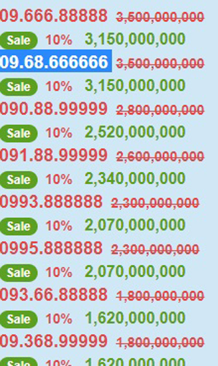 Tại một cơ sở khác, chiếc sim số 09.666.88888 được rao bán giá 3,2 tỷ đồng; 09.68.666666 giá 3,1 tỷ… cùng nhiều sim trị giá hơn 1 tỷ đồng trở nên khác.