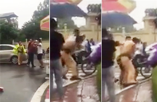 Dù một số người dân và chiến sĩ CSGT khác cố gắng can ngăn nhưng thanh niên áo trắng vẫn hùng hổ lao vào tấn công chiến sĩ CSGT.